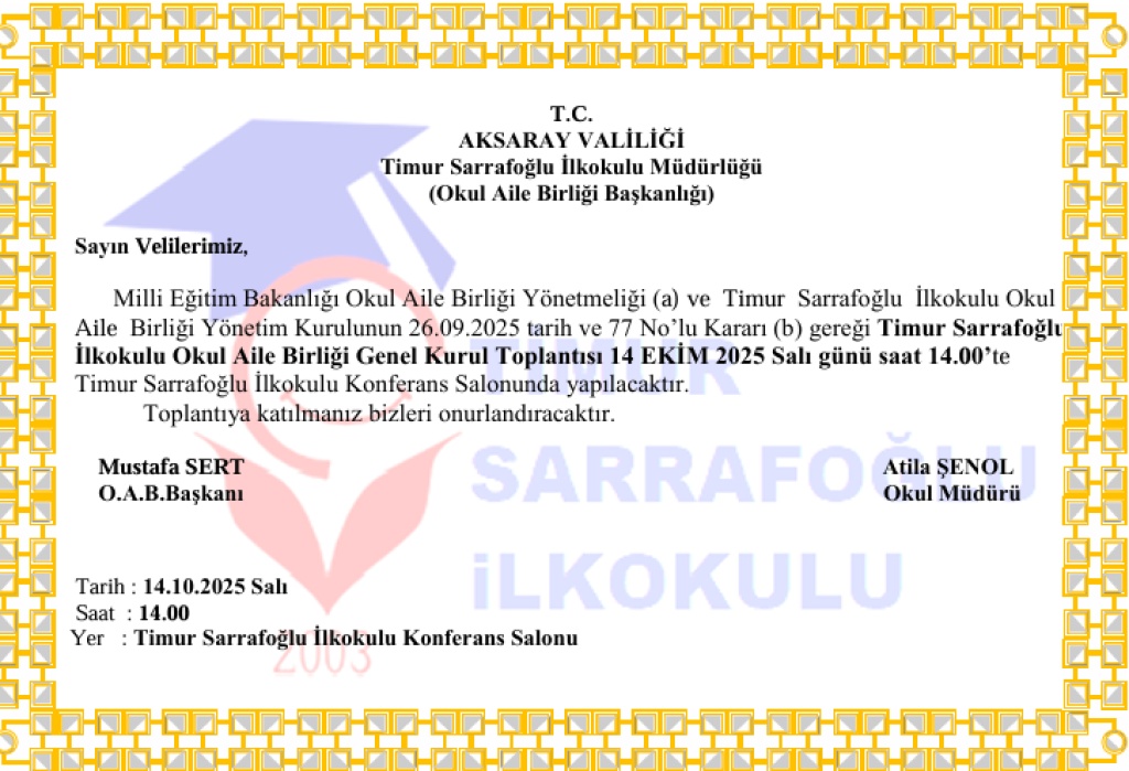 Milli Eğitim Bakanlığı Okul Aile Birliği Yönetmeliği (a) ve Timur Sarrafoğlu İlkokulu Okul Aile Birliği Yönetim Kurulunun 26.09.2025 tarih ve 77 No’lu Kararı (b) gereği Timur Sarrafoğlu İlkokulu Okul Aile Birliği Genel Kurul Toplantısı 14 EKİM 2025 Salı günü saat 14.00’te Timur Sarrafoğlu İlkokulu Konferans Salonunda yapılacaktır.Genel Kurul üyelerine ilanen duyurulur.